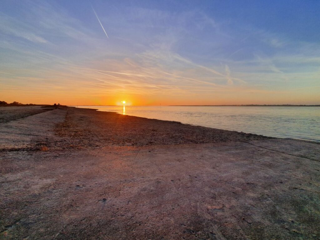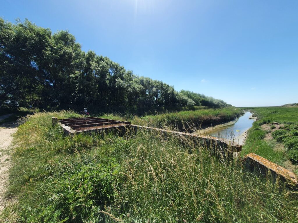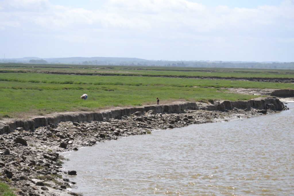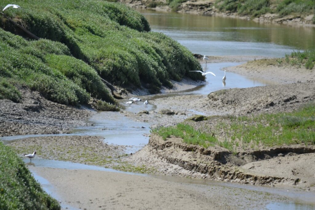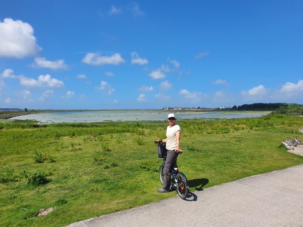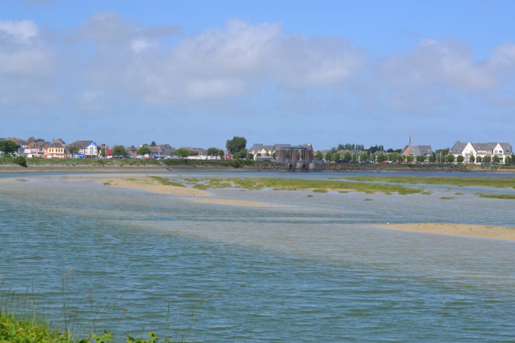 Le ciel est bleu et il fait chaud pour la région. Une belle journée pour une flânerie à vélo. Notre promenade du jour commence par un parcours de liaison entre les deux communes de la baie : Saint Valery sur Somme et Le Crotoy. Ce sont également les deux principaux ports. Saint Valery a été le théâtre de l’histoire ancienne : le départ de Guillaume Le Conquérant pour envahir la Grande-Bretagne et Jeanne d’Arc y a été incarcérée avant son procès à Orléans. Le Crotoy abrite l’histoire moderne avec la naissance du tourisme au dix-neuvième siècle et la première école de pilotage créée en France par les frères Caudron. La liaison n’est pas très agréable. Elle longe une route à grande circulation. La piste cyclable est en contrebas. Rien de très passionnant jusqu’à l’arrivée sur Le Crotoy où une bifurcation nous permet de rejoindre la ville en passant par le bassin de chasse. Là, c’est l’immersion dans la baie avec le schorre, les pêcheurs à pieds, les oiseaux, le calme et le bruit de nos chaînes.