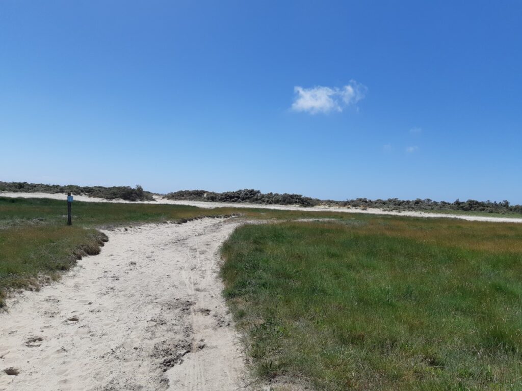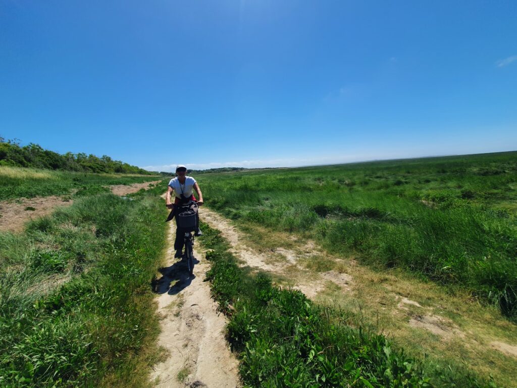 A l’approche de Saint-Firmin, nous bifurquons pour rejoindre le sentier côtier du nord de la baie. Séquence tout-terrain d’abord soft, quelques ornières, mais rien de bien méchant. Puis, un peu plus hard pour nous et nos petits vélos : du sable bien mou sur un chemin qui sillonne à travers les dunes. Impossible de tenir sur nos vélos, nous les poussons difficilement le long d’un paysage magnifique, heureusement. Une troupe de cavaliers sur des chevaux Henson, typiques de la région, rigolent bien en nous voyant pousser nos montures récalcitrantes dans le sable et nous plaisantons avec eux. Il fait soif et nous ressentons un peu la fatigue mais nous finissons ce sentier, appelé le sentier des bergers, au milieu des pins et leur senteur envahit nos narines. Même forêt, même sable, même odeur, même soleil, nous sommes transportés illico en méditerranée, avec quelques degrés de moins tout de même.