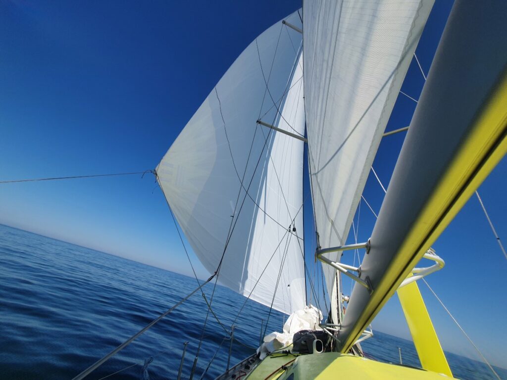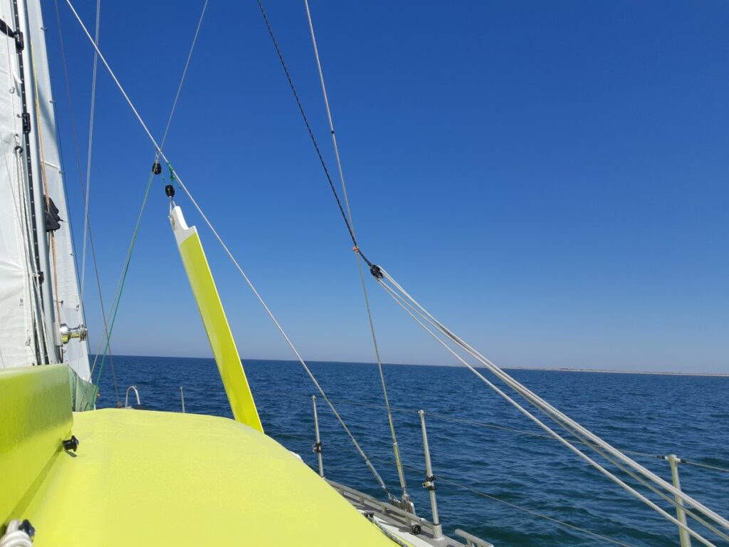La direction du vent est plus Est que Nord-Est lorsque nous démarrons notre navigation. C’est plutôt bon pour l’état de la mer car le vent vient de terre, et pour notre progression car nous faisons route directe. Mais le vent est un peu anémique. L’heure du gennaker a sonné. Ça prendra un bon moment pour le hisser car c’est sa première apparition en public et, pour tout vous dire, il est un peu timide. Heureusement, il s’agissait d’une répétition, et il y aura plusieurs détails à régler pour sa prochaine montée sur scène.