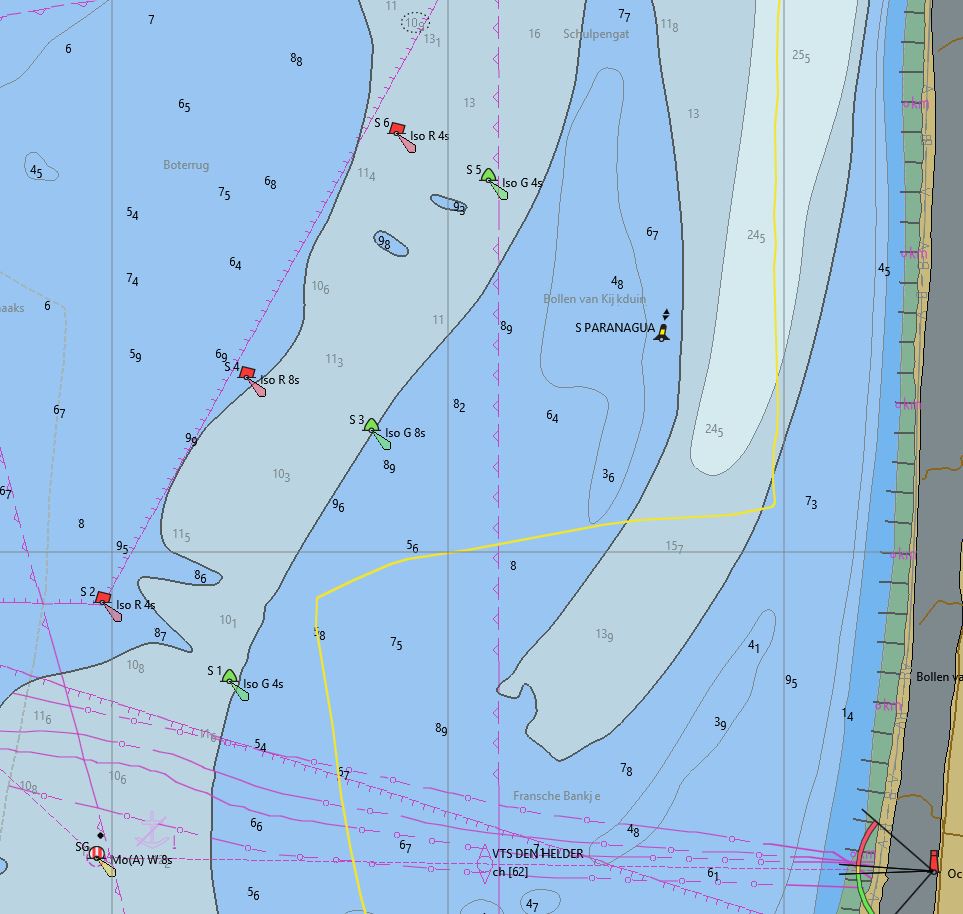 Quelques longueurs plus loin, c’est un hélicoptère que nous voyons arriver en face de nous. Den Helder est décidemment très fréquenté en cette saison. Je me précipite dans la timonerie pour prendre la VHF portable car j’ai déjà eu l’occasion d’être survolé par un hélicoptère et, en général, c’est pour une bonne raison. Je l’allume et la règle sur le canal 16. Rien, silence radio. L’hélicoptère se stabilise au-dessus de Strana. Sa porte latérale est grande ouverte. C’est un hélicoptère de secours en mer et plusieurs membres d’équipage sont penchés par cette porte. S’agit-il d’un exercice ? Un pouce se lève et on aperçoit les sourires aux lèvres de sauveteurs. Je crois que le bateau leur a plu. La couleur jaune (teinte RAL 1016 si vous souhaitez faire une croix sur votre pont) n’attire pas que les insectes. A 16h30, nous sommes à l’entrée du passage. Le doigt était bien mouillé à l’apéro. Le vent se renforce dans le passage où nous démarrons le moteur pour affaler les voiles avant d’entrer dans Den Helder.