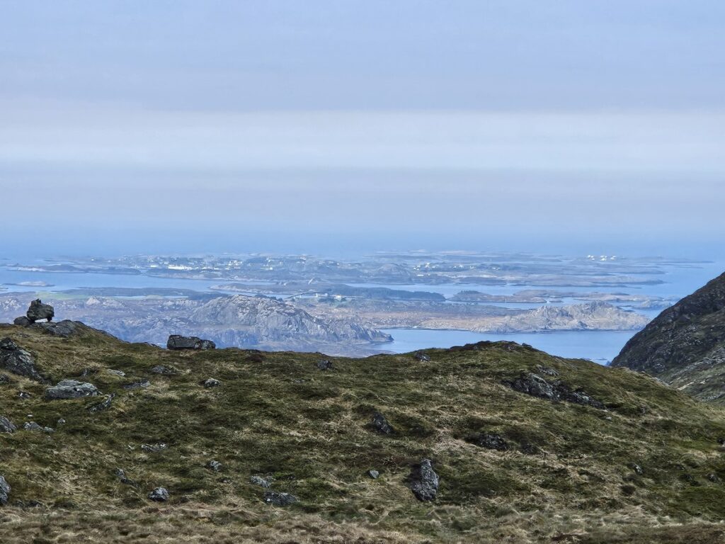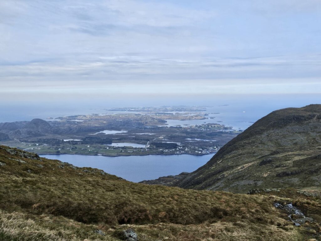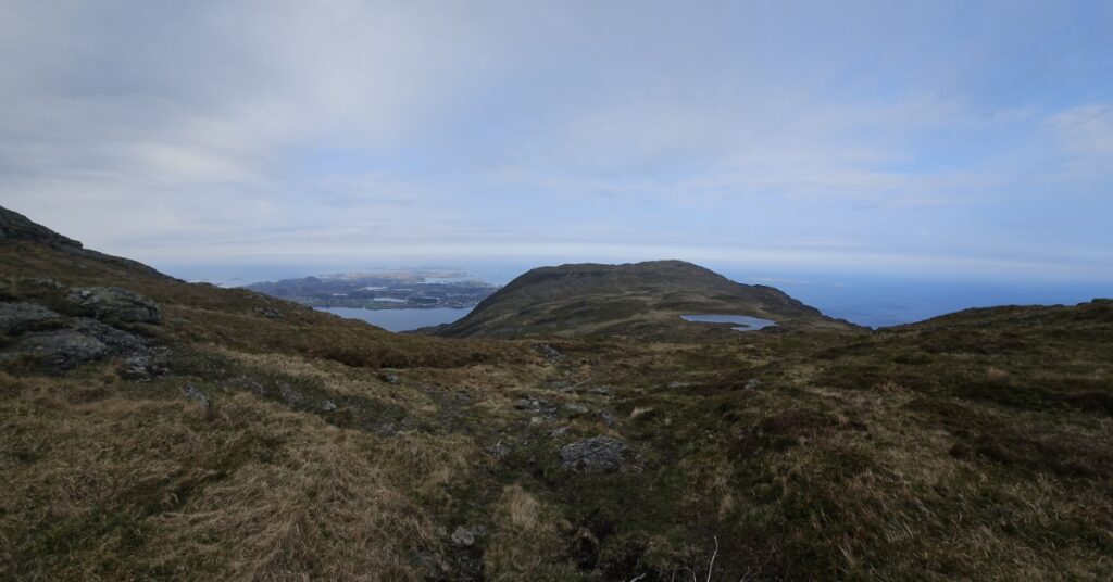 Les reliefs qui couronnent Alden sont nommés « Den Norske hesten », ce qui se traduit par « le cheval norvégien ». Vu de loin, la montagne donne l’impression, en effet, qu’il s’agit d’un cheval couché. Elle a deux sommets : Ytstenova (418 m) et Instenova (481 m) ; on soulignera le pragmatisme des Norvégiens dans l’attribution des noms géographiques : le sommet extérieur (Ytste) et le sommet intérieur (Inste). C’est un amer remarquable pour qui vient du large. Il est visible à 100 km des côtes (environ 87 MN). Si le cheval est au repos, ça ne sera pas le cas pour nous : la montée est courte, mais raide dans sa partie initiale. Ce n’est pas pour rien qu’Alden tire son nom du latin « altus », qui signifie « haut ».
