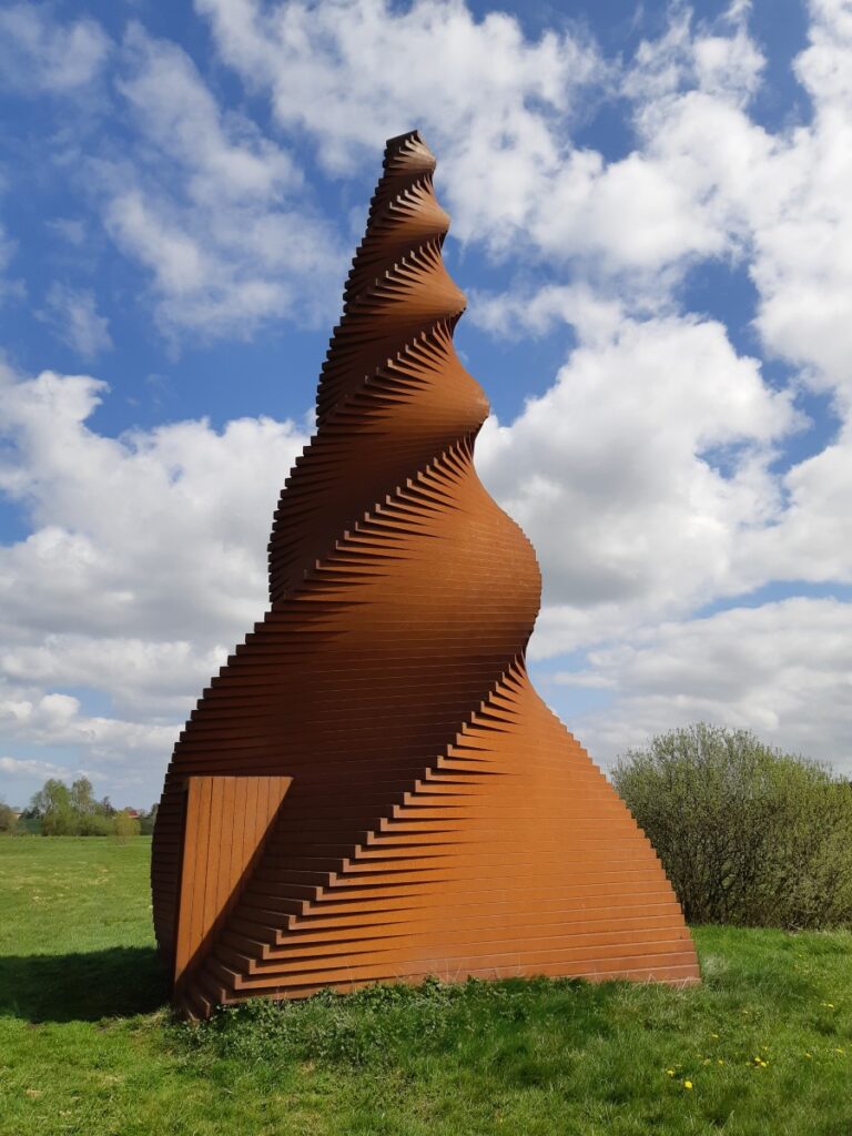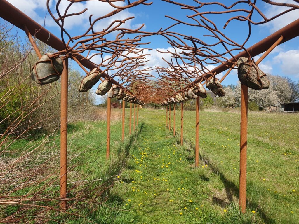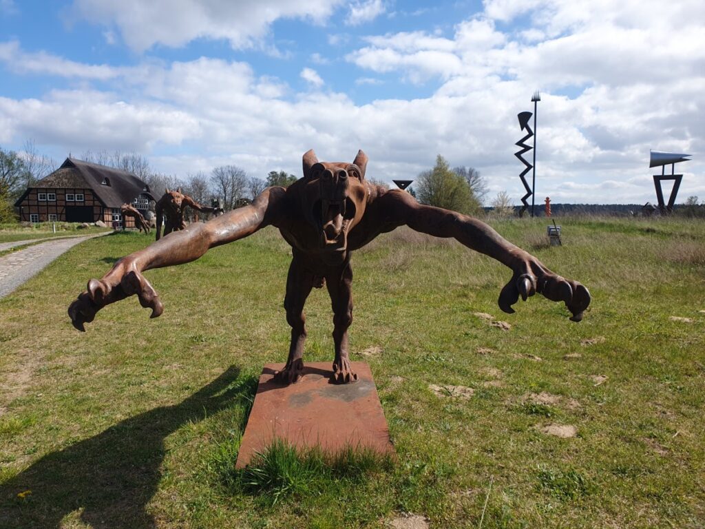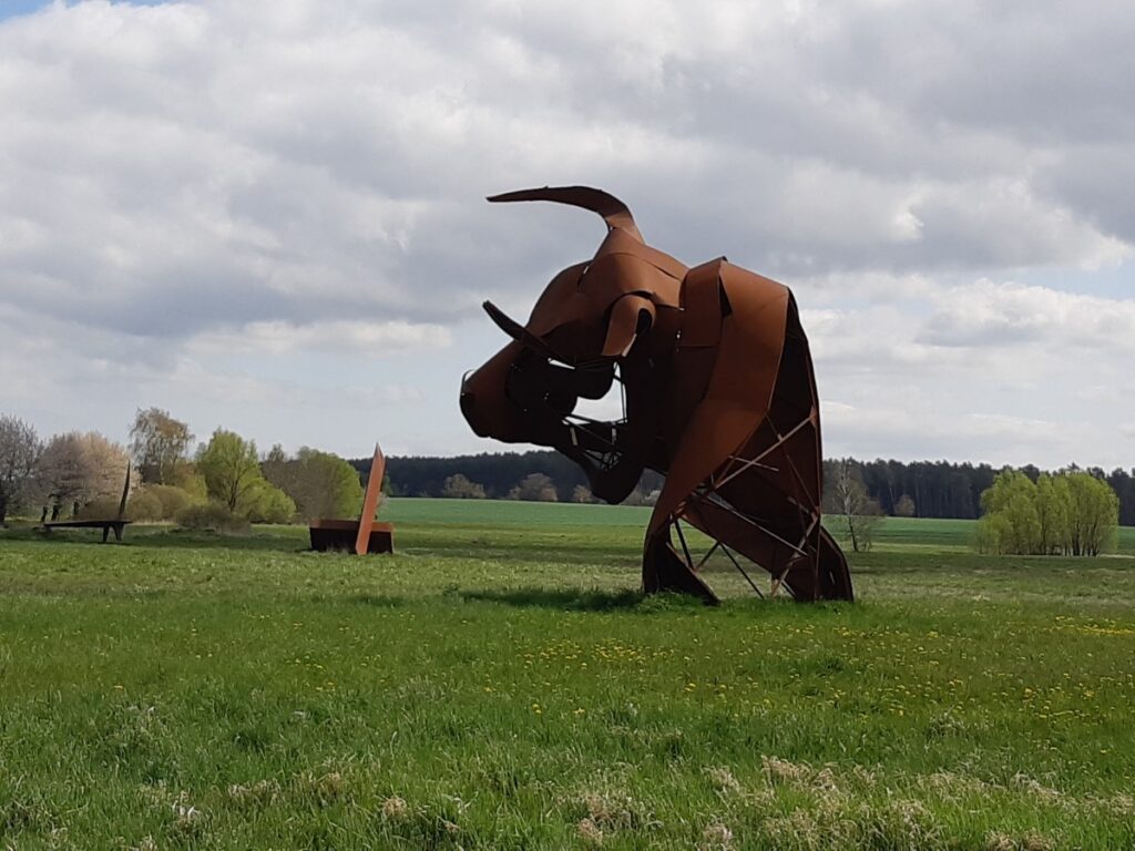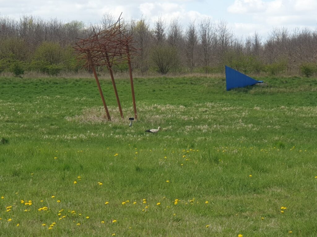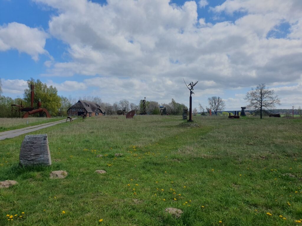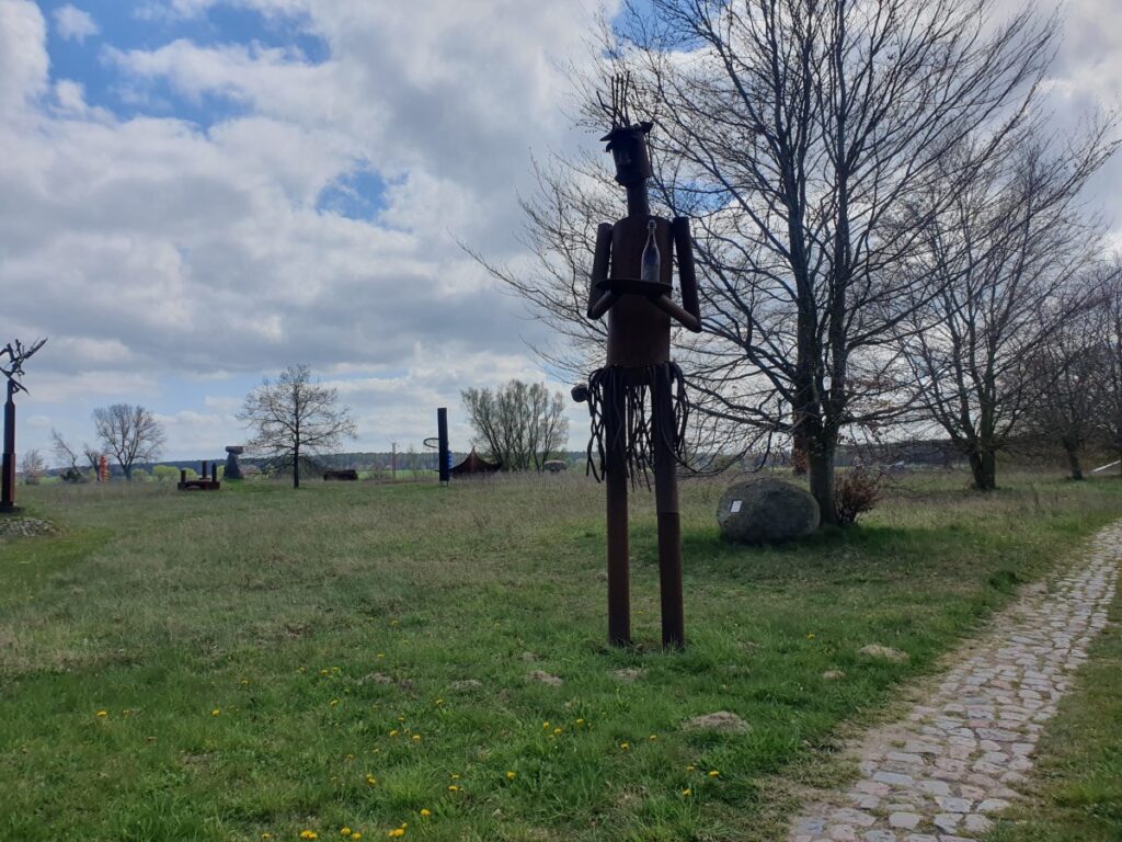En route pour Wolgast où se trouve le pont qui relie Usedom au continent au nord de l’île, nous tombons sur une curiosité qui nous fait faire une pause sur la route. Un immense champ où sont semées des sculptures en métal, parfois monumentales, parfois étranges, par des artistes du monde entier. Un chemin à peine tracé nous emmène de l’une à l’autre avec, au milieu, la surprise de rencontrer une cigogne peu intéressée par les sculptures, mais très concernée par ce que contient le sous-sol. C’est l’heure du repas. À la sortie du parcours, une petite boîte pour permettre aux visiteurs de laisser une obole pour remercier les artistes.