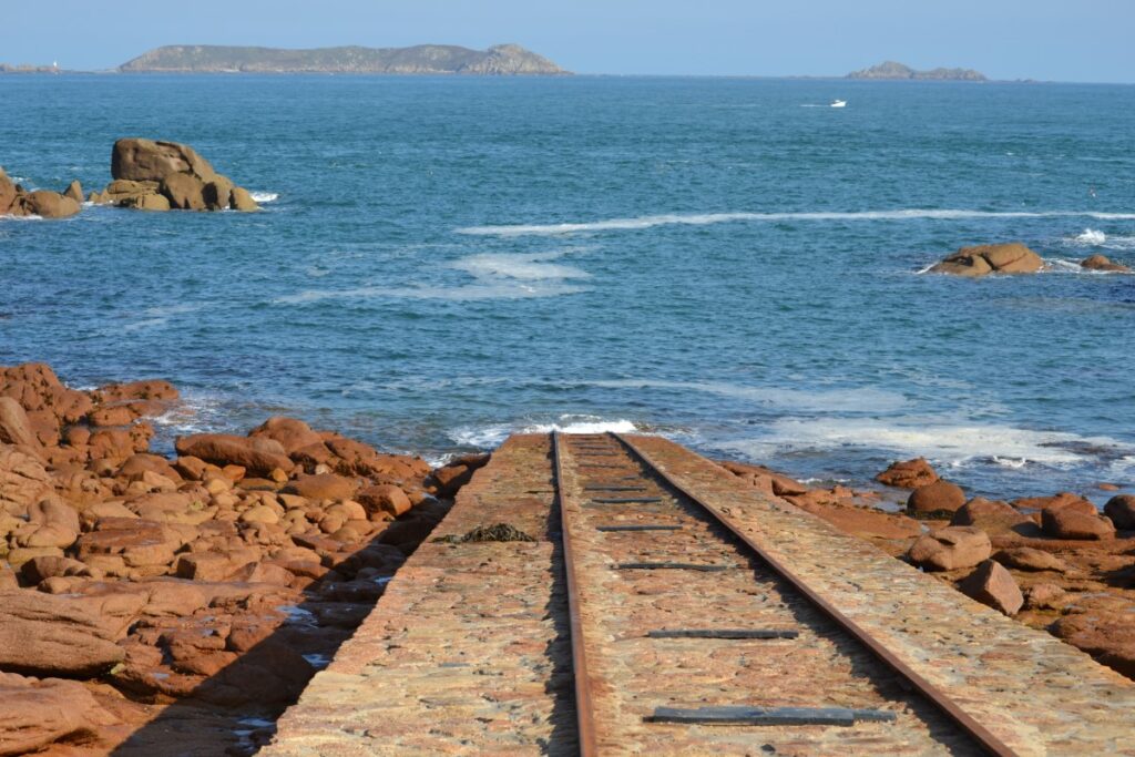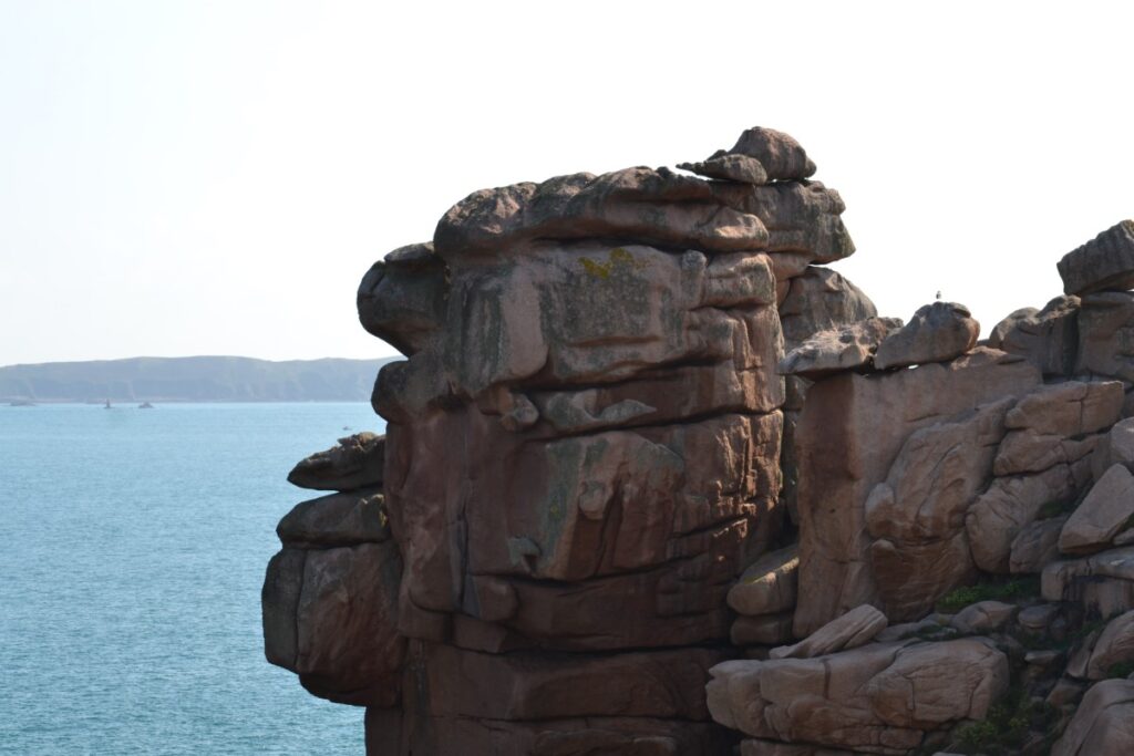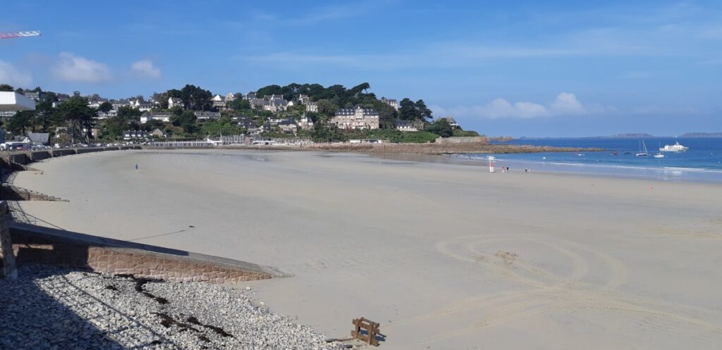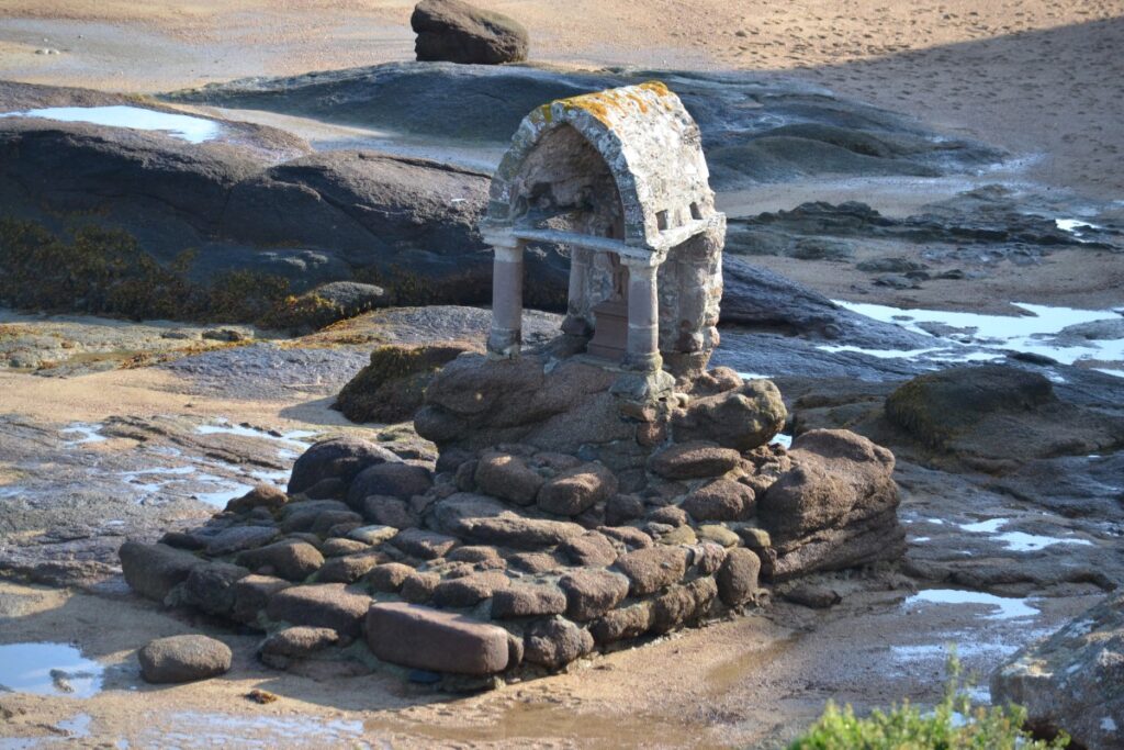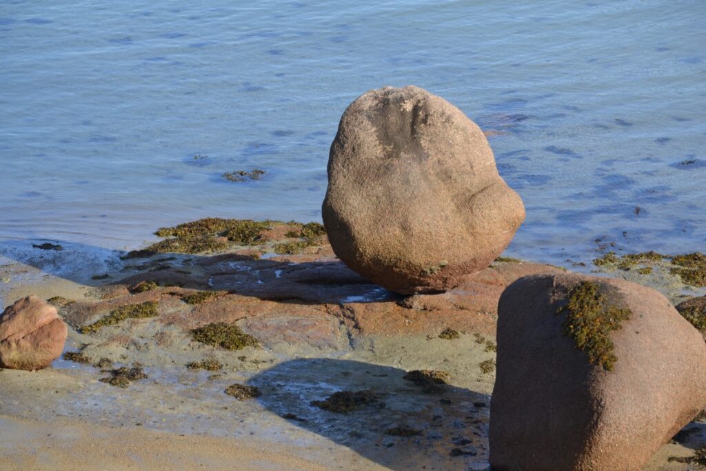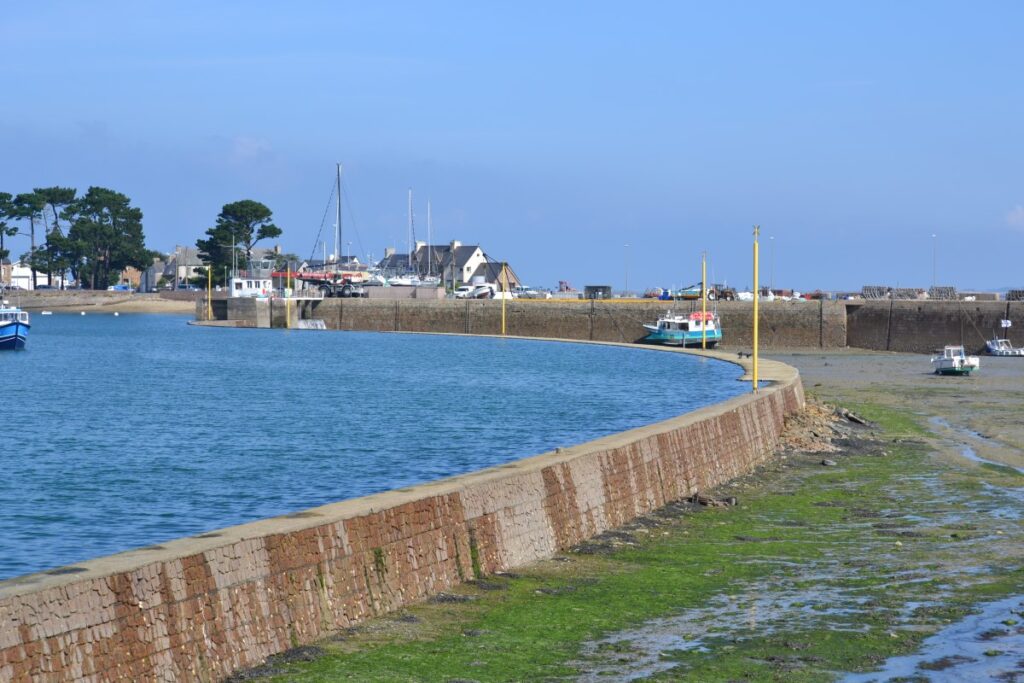 Cette région est le pays du granit rose. Le sentier des douaniers traverse ces blocs jetés ça et là par des géants. Nos jambes nous portent vaillamment jusqu’à Perros-Guirec par la côte. Guirec, c’est le prénom breton du coin: la plage du Guirec, l’oratoire de saint Guirec et la ville de Perros-Guirec. Nous faisons un halte au port pour examiner l’entrée de ce port fermé par une digue auquel on accède par une petite porte.